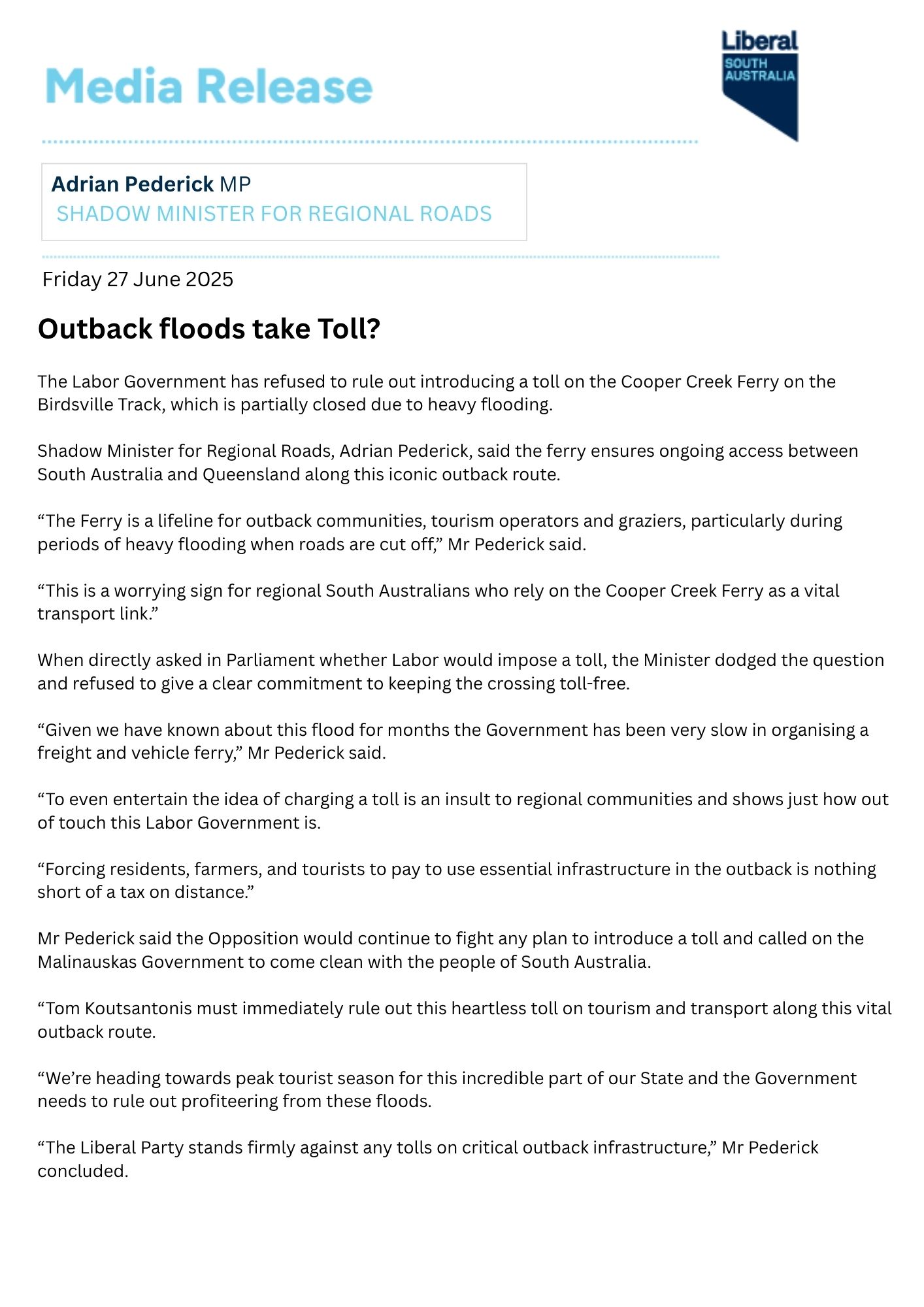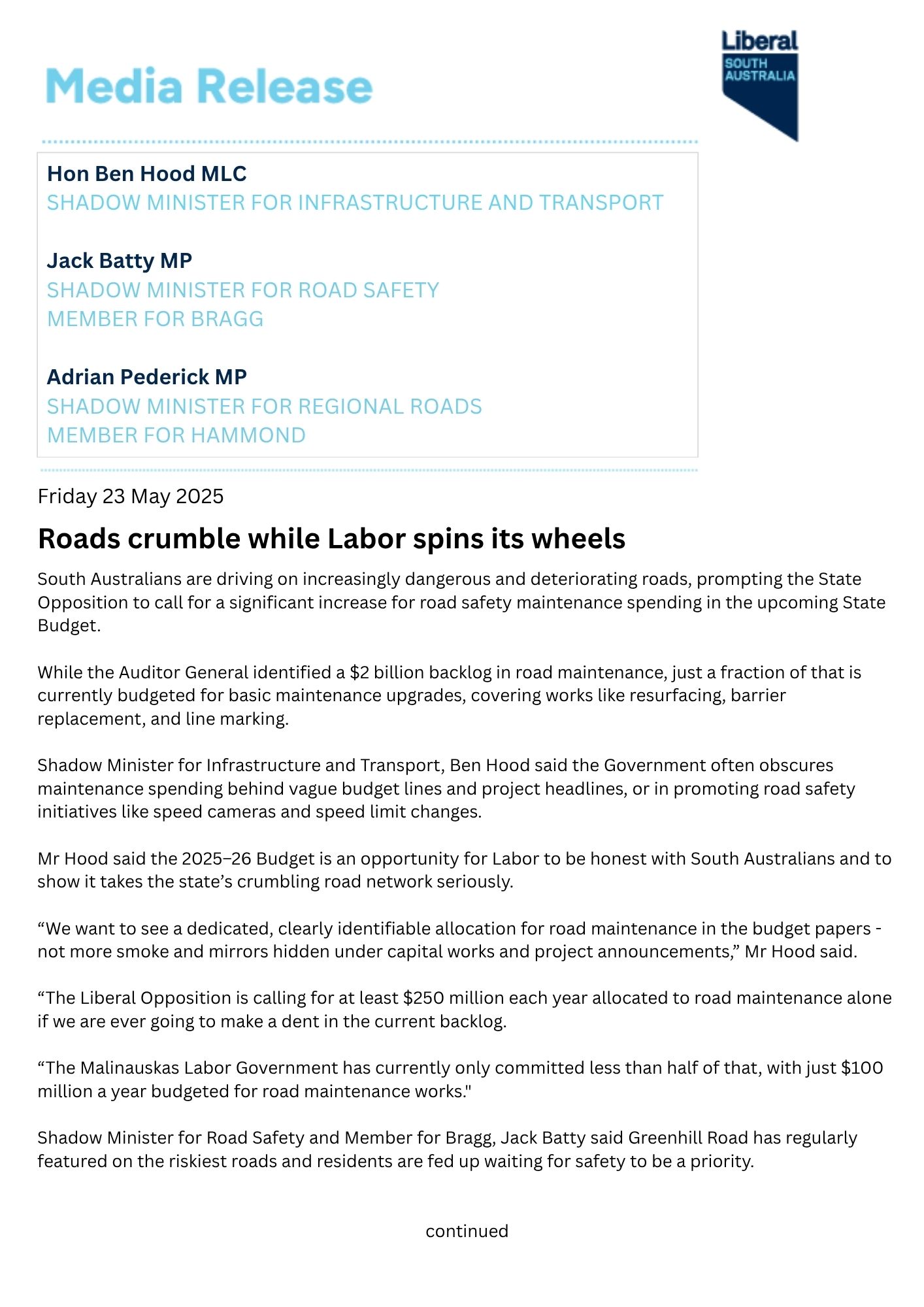 Peter Malinauskas’ 2024-25 State Budget has shown once again that Labor does not consider regional roads a priority with huge cuts to the capital works program and minimal funding for new projects.