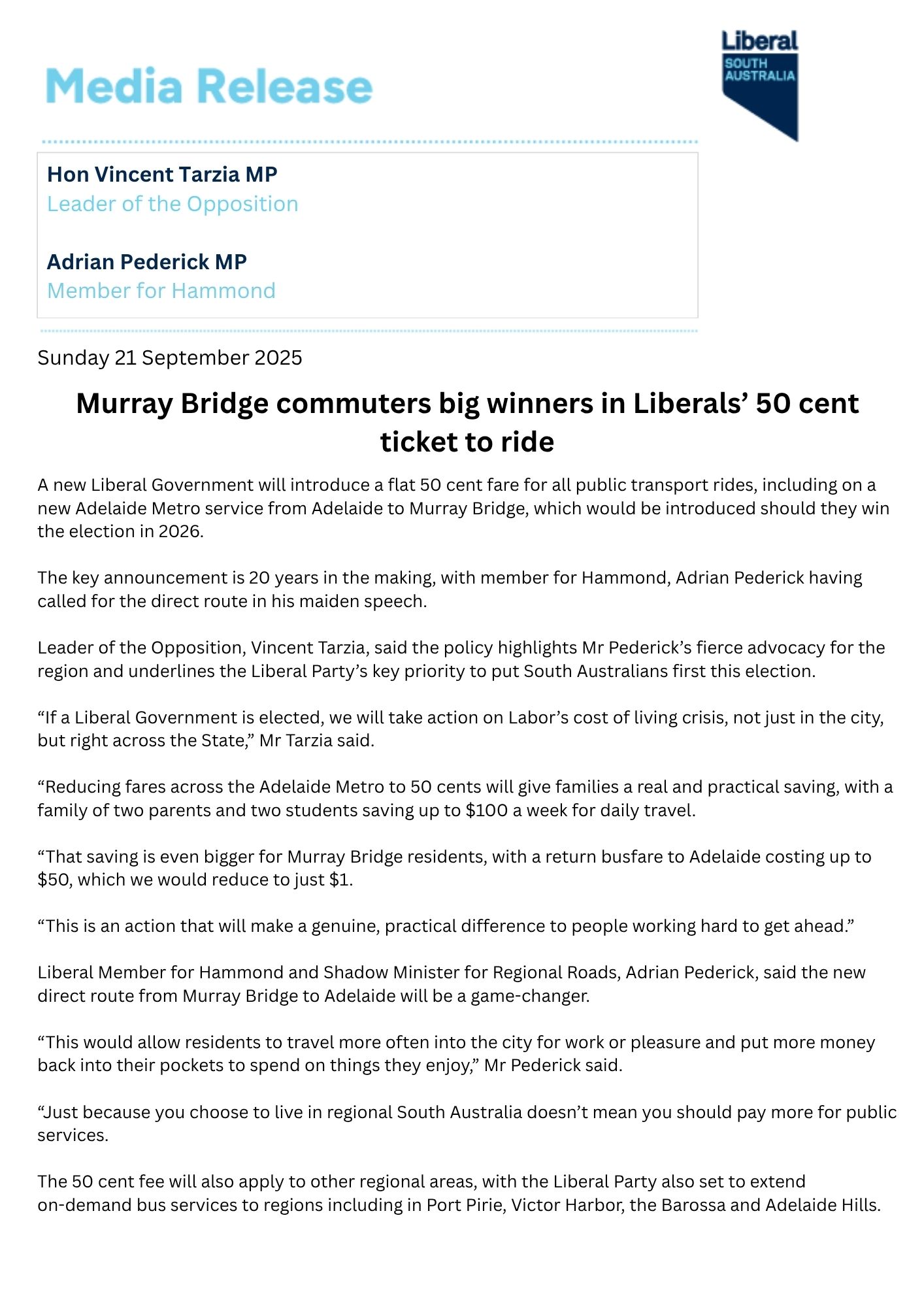 Member for Hammond Adrian Pederick welcomes the announcement by Costa Property Group and Grange Development of their plan to build South Australia’s largest single development in roughly 70 years on the outskirts of Murray Bridge.