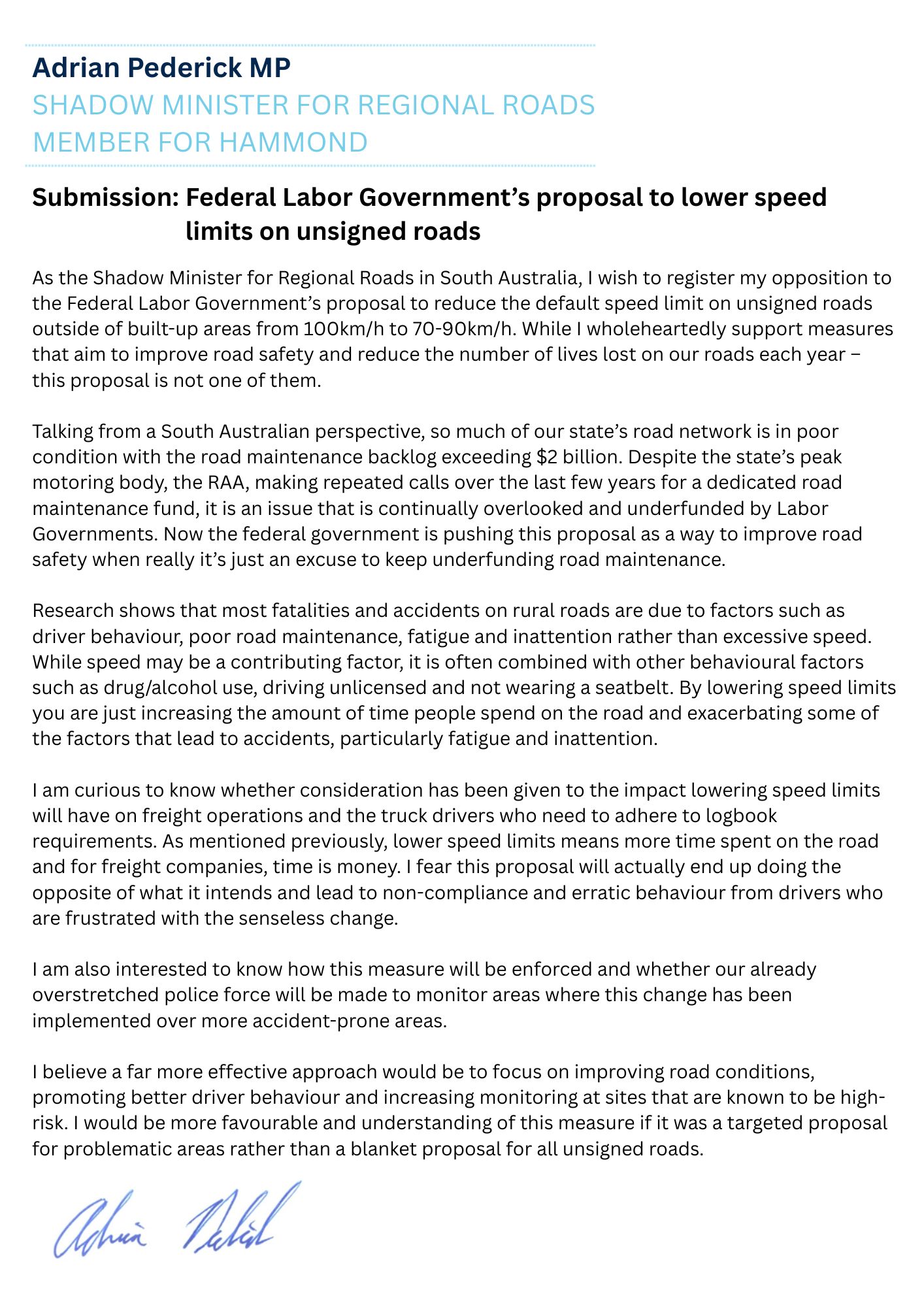 Submission: Federal Labor Government's proposal to lower speed limits on unsigned roads